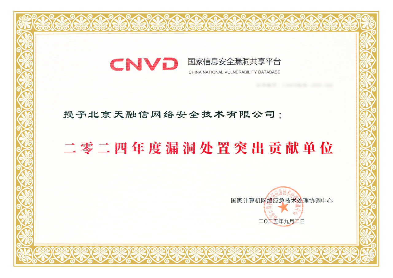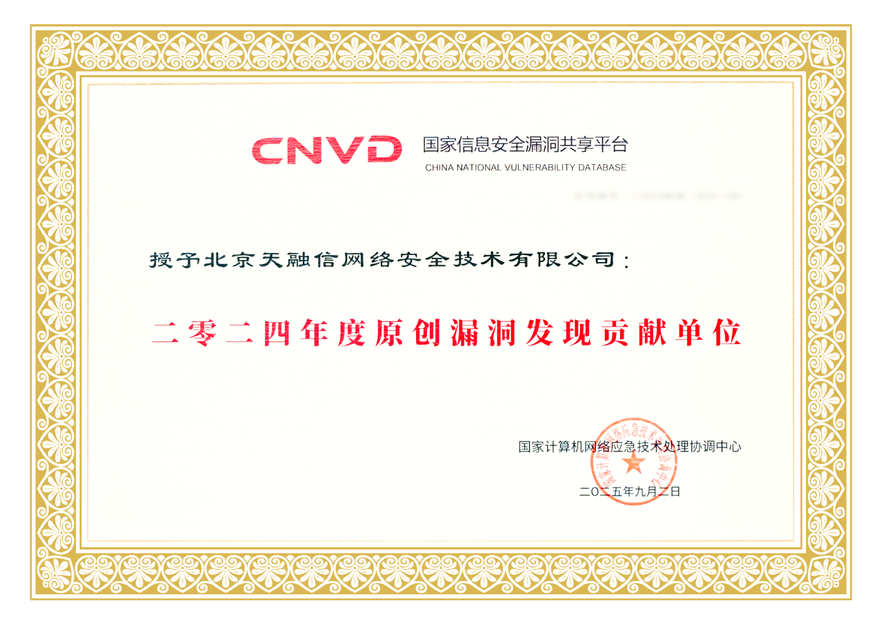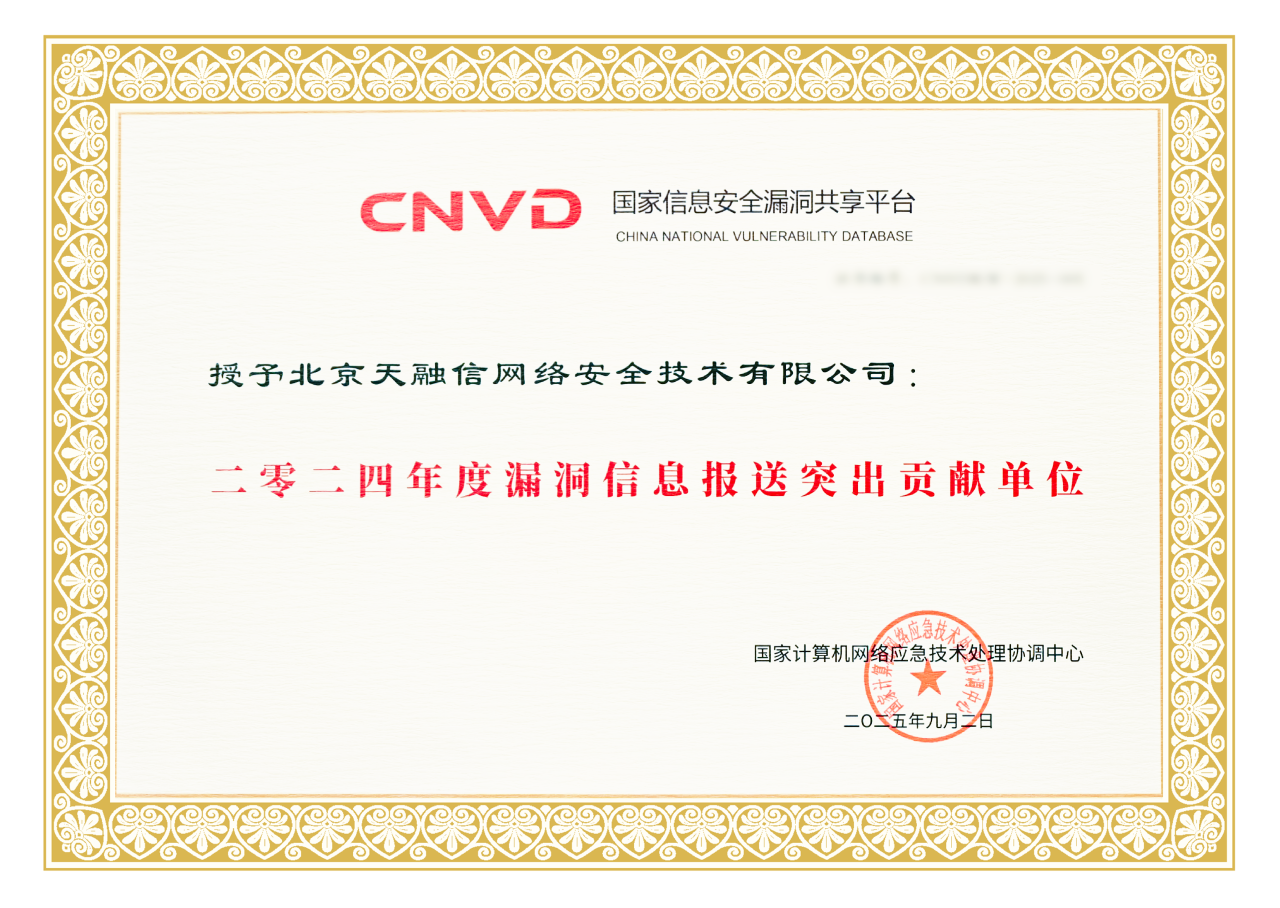 天融信在2024年度向国家信息安全漏洞共享平台(CNVD)累计报送了数百个原创漏洞,覆盖大模型、车联网、安防设备、网关设备、工控设备、通用建站系统、OA系统、通用办公软件等关键领域,以及Linux Kernel等国际主流软件、操作系统,为排除网络空间安全隐患提供了强有力的安全保障。