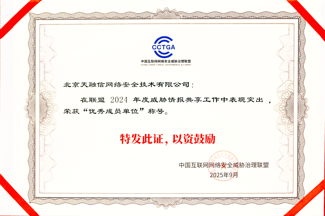 作为“中国互联网网络安全威胁治理联盟”首批成员单位之一,天融信持续为联盟提供威胁情报,并承担了大量情报研究和处置工作。未来,天融信将继续发挥技术优势,为维护国家网络空间安全贡献企业力量。