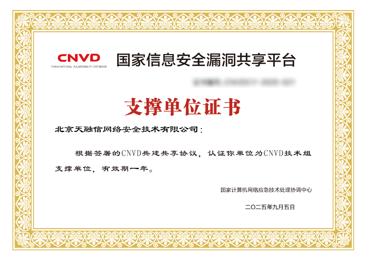 国家信息安全漏洞共享平台(CNVD)是目前国内最权威的官方漏洞平台之一。本次评选从漏洞收集工作、漏洞发现工作、漏洞威胁风险大数据工作、漏洞技术分析工作、重大漏洞事件响应工作和集体任务协作六个能力象限,对支撑单位的年度工作情况进行了统计和评价。自2016年首批入选CNVD技术组支撑单位,天融信至今已连续十年入选。