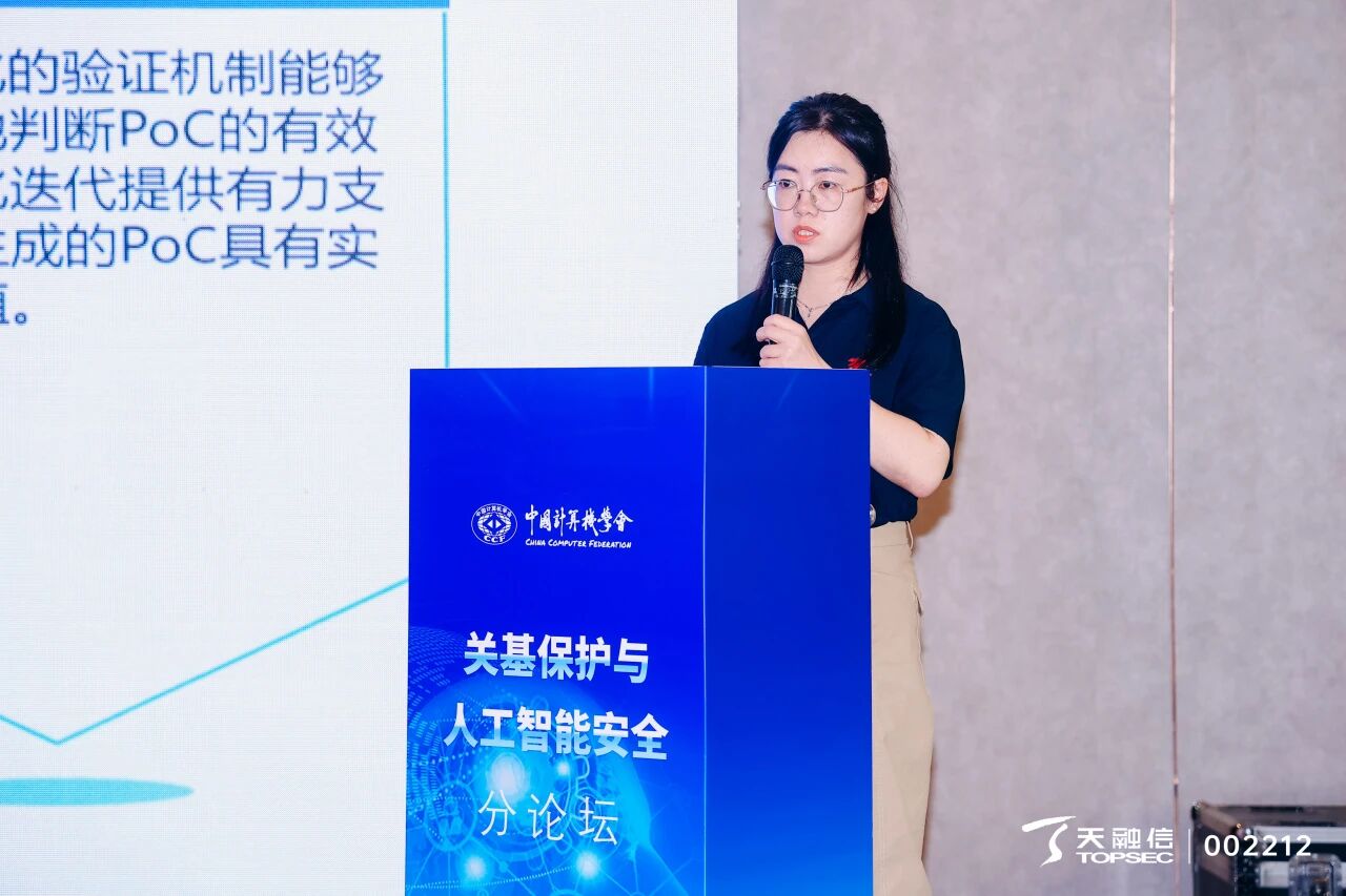 在第40次全国计算机安全学术交流会关基保护与人工智能安全分论坛上,天融信科技集团胡雨翠作为代表进行了《车联网安全自动化漏洞利用方法研究》论文的分享。她表示,传统的漏洞验证依赖人工编写概念验证(PoC)代码,不仅效率低,且受限于漏洞报告的非结构化表述,难以应对漏洞数量的爆发式增长。针对这一难题,论文提出了一种融合大语言模型与程序分析技术的自动化PoC生成与验证方法。该方法通过“信息提取—代码生成—漏洞验证—反馈优化”的闭环机制,实现了从非结构化漏洞描述到可验证PoC的端到端自动化。