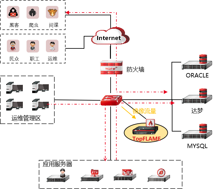 旁路部署是最常见的部署方式,将TopFLAME旁路部署到目标网络中,监听镜像流量,进行解析分析,全面检测。旁路部署拓扑简单,不改变原有网络结构,系统上线方便快捷,被动监听镜像流量即可实现威胁检测。